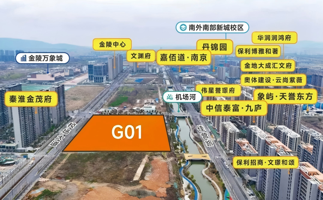 该地块位于校场大道以南、神机营路以西,与秦淮金茂府仅一路之隔,距离南部新城景观主轴——机场跑道公园不足300米。这块稀缺宅地的成功出让,标志着南部新城核心区建设再提速。据悉,机场跑道公园已明确年内开工,未来将打造为城市文化新地标。地块周边南外明远中小学、万象城、中芬合作交流中心、丽笙酒店等顶级配套环伺,堪称主城核心的“黄金宝地”。