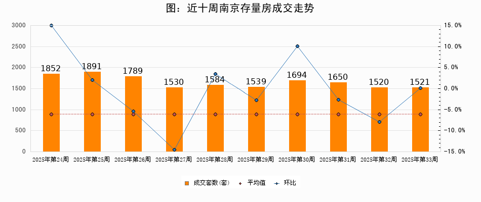存量房方面,第33周南京存量房成交1521套,较上周增加1套,环比上涨0.1%。从近十周成交走势来看,周均成交套数为1657套,本周低于平均水平8.2%。
