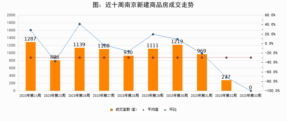 进入2025年第33周(08月11日-08月17日),南京新建商品房成交0套,较上周减少277套,环比下降100%。从近十周成交来看,周均成交套数为884套,本周成交0套,低于近十周平均成交量100%。