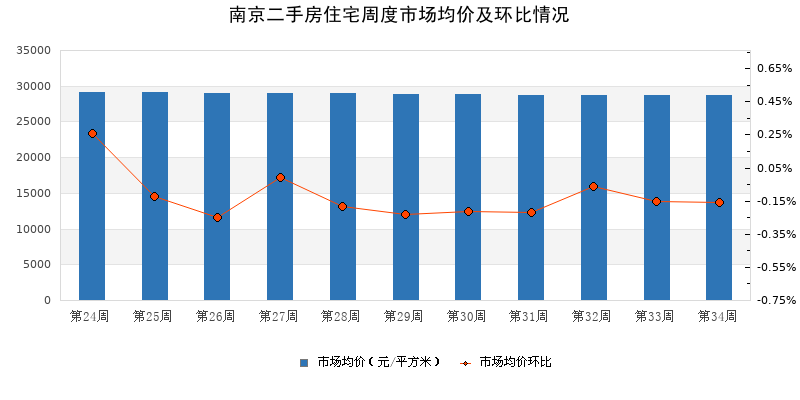 第34周全市二手住宅挂牌均价为28,657元/㎡,环比微降0.16%,整体保持平稳。