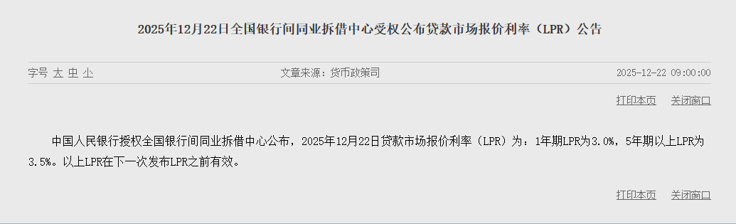 中国人民银行授权全国银行间同业拆借中心公布,2025年12月22日,贷款市场报价利率(LPR)为:1年期LPR为3.00%,5年期以上LPR为3.50%,均较上月保持不变,以上LPR在下一次发布LPR之前有效。
