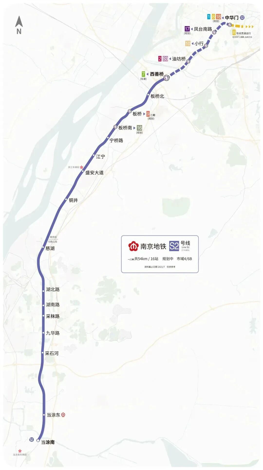 宁马城际铁路S2线为南京首条跨省地铁线路,全长约54公里,南京段设8座车站,马鞍山段设8座车站,北起西善桥站,南至当涂南站。根据施工计划,该线路将于3月31日开通运营,届时南京与马鞍山之间可实现轨道交通直达。
